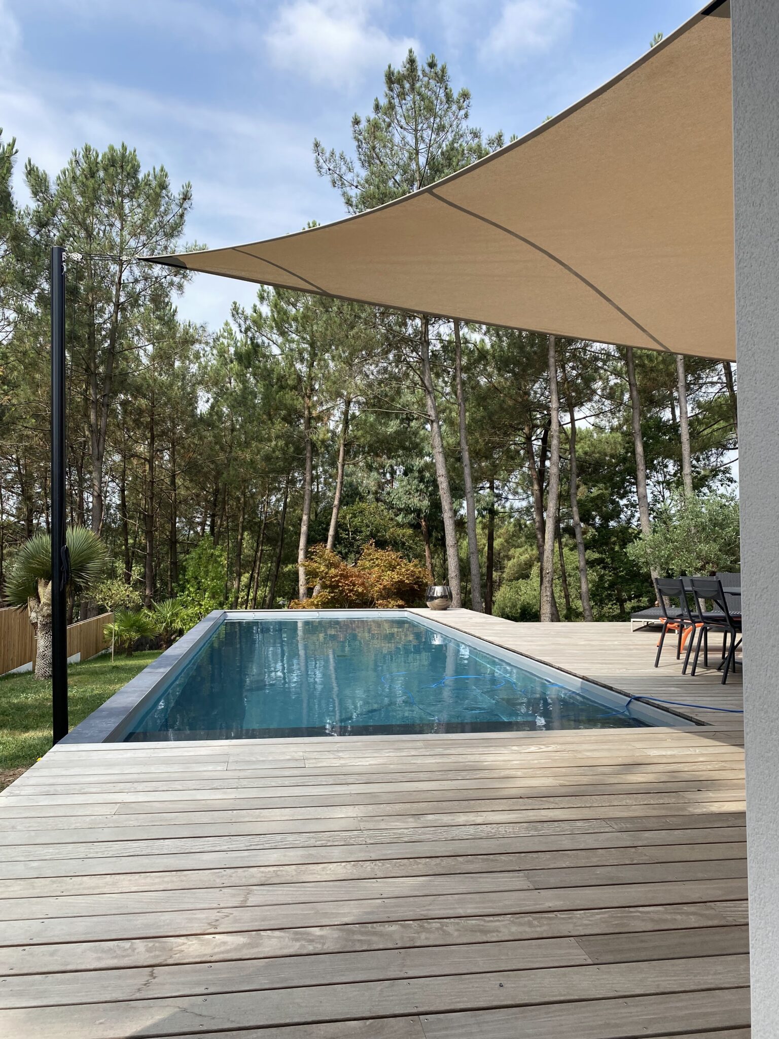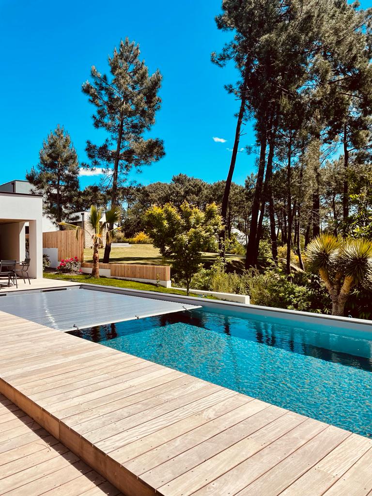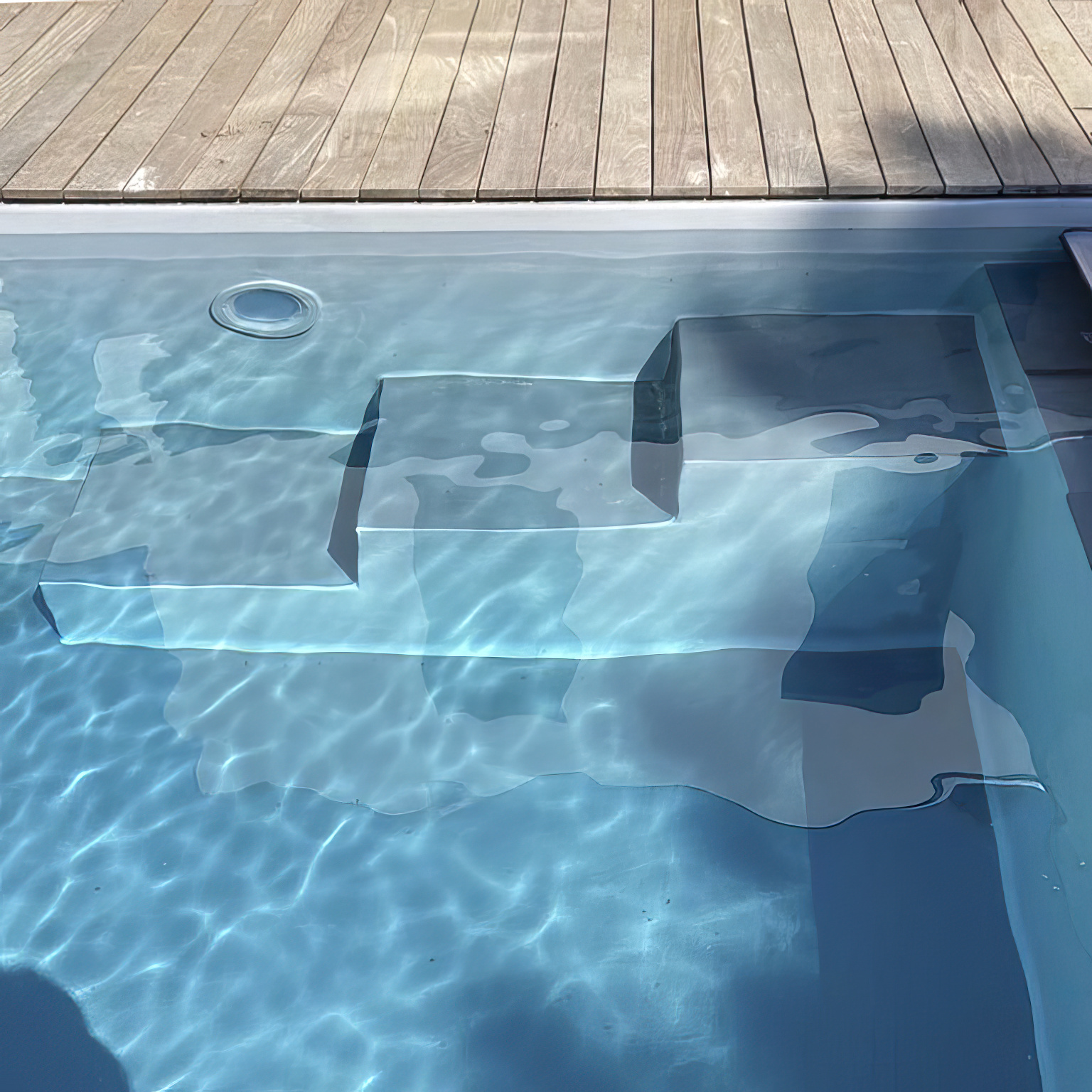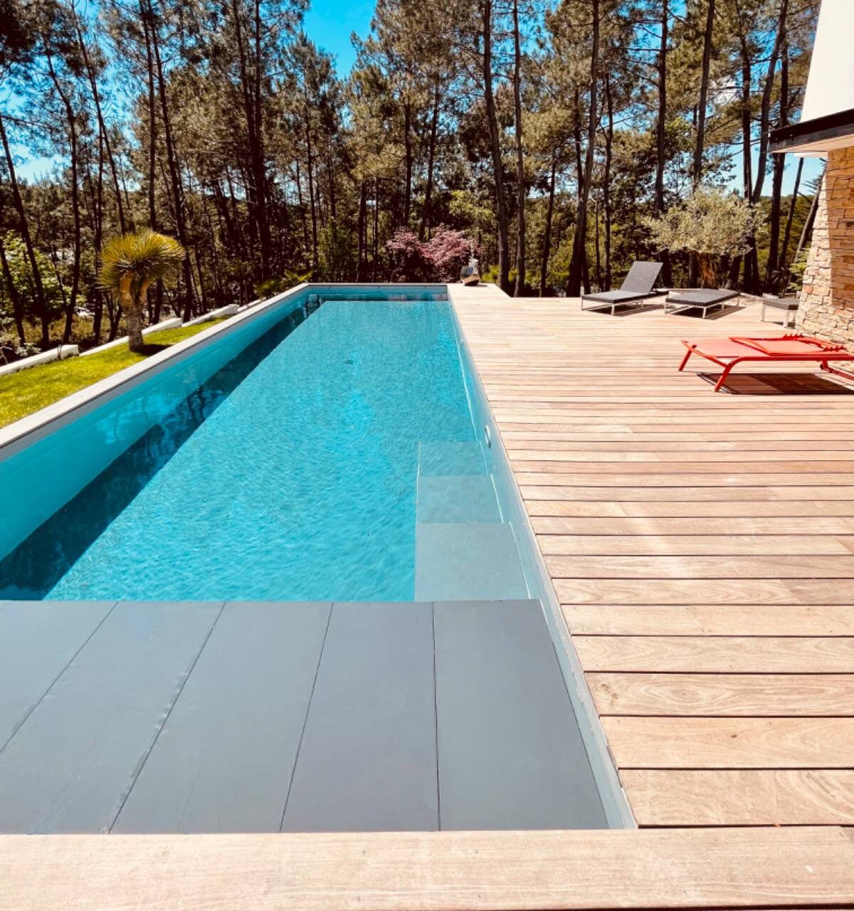 Découvrez ce couloir de nage de 11 x 3,5 m avec son escalier droit et sa plage immergée, idéale pour se détendre ou s’allonger les pieds dans l’eau tout en profitant de la nage dans la partie plus profonde de la piscine.