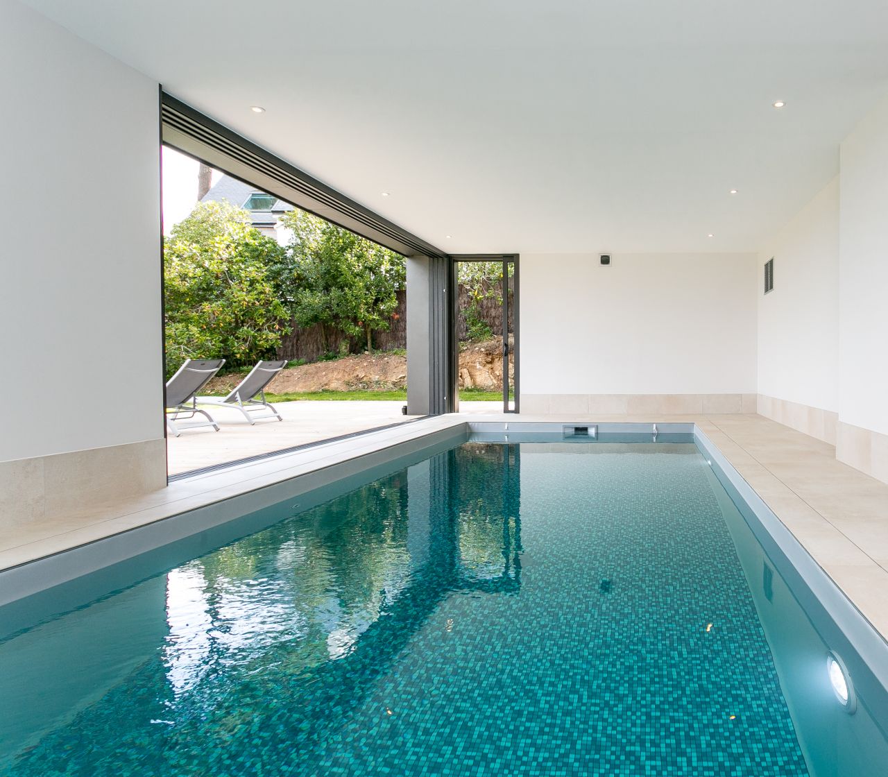 Profiter du confort de l’intérieur et de la beauté de l’extérieur, voilà une piscine qui propose un compromis idéal ! Grâce à ses larges baies vitrées, il est possible de se prélasser tout en ayant vue dehors.