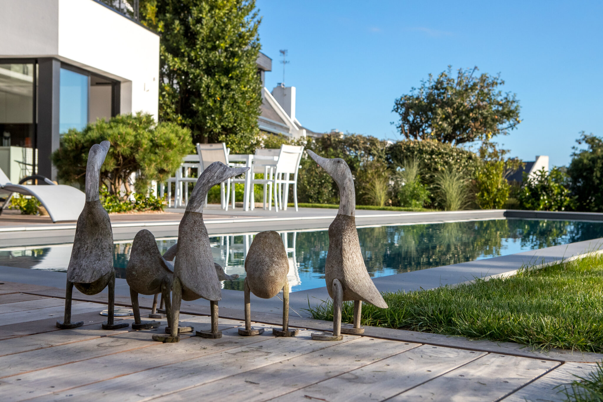 La piscine est entourée d’une terrasse en grés cérame qui s’insère à la terrasse en bois afin de prolonger un coté naturel.