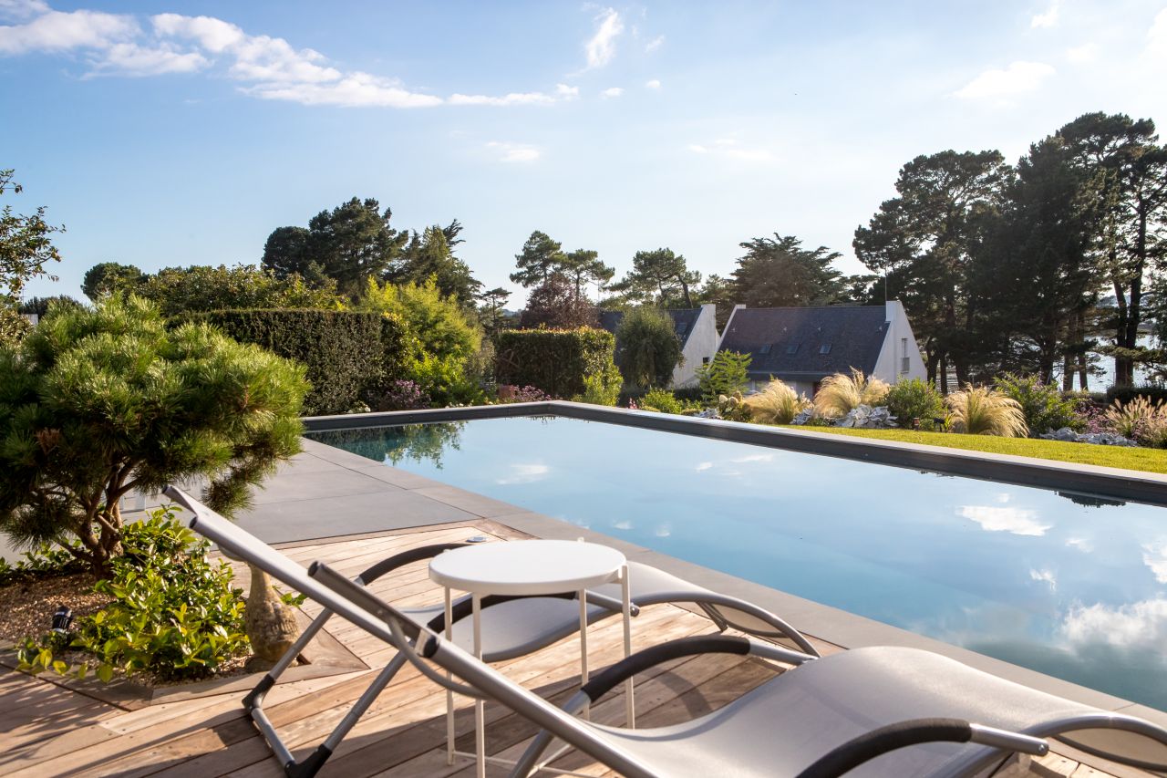 Une piscine aux belles lignes modernes située à Séné qui donne sur le Golfe du Morbihan.
